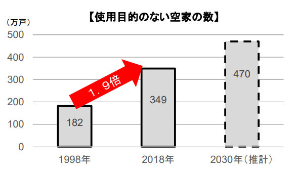 1998年からの20年間で使用目的のない空き家は1.9倍にも増え、今後も更に増えると予測されています。
