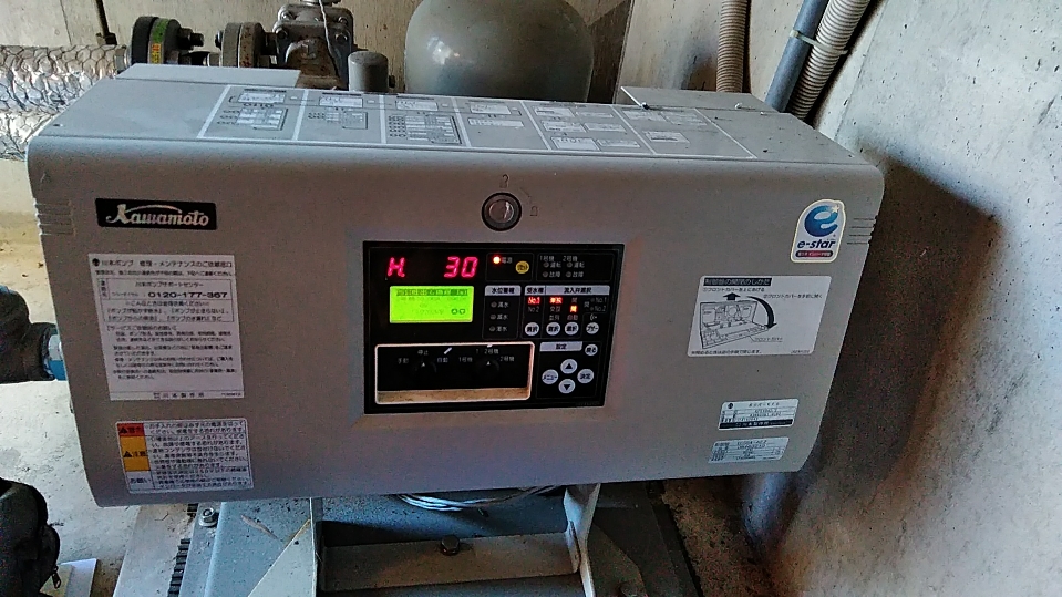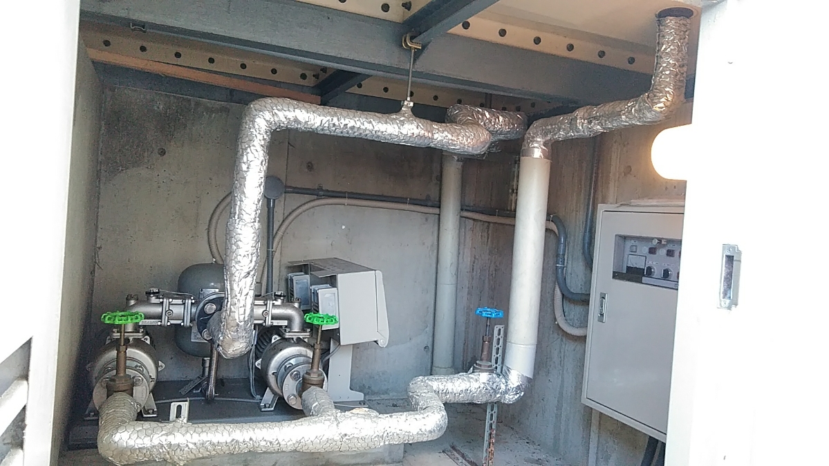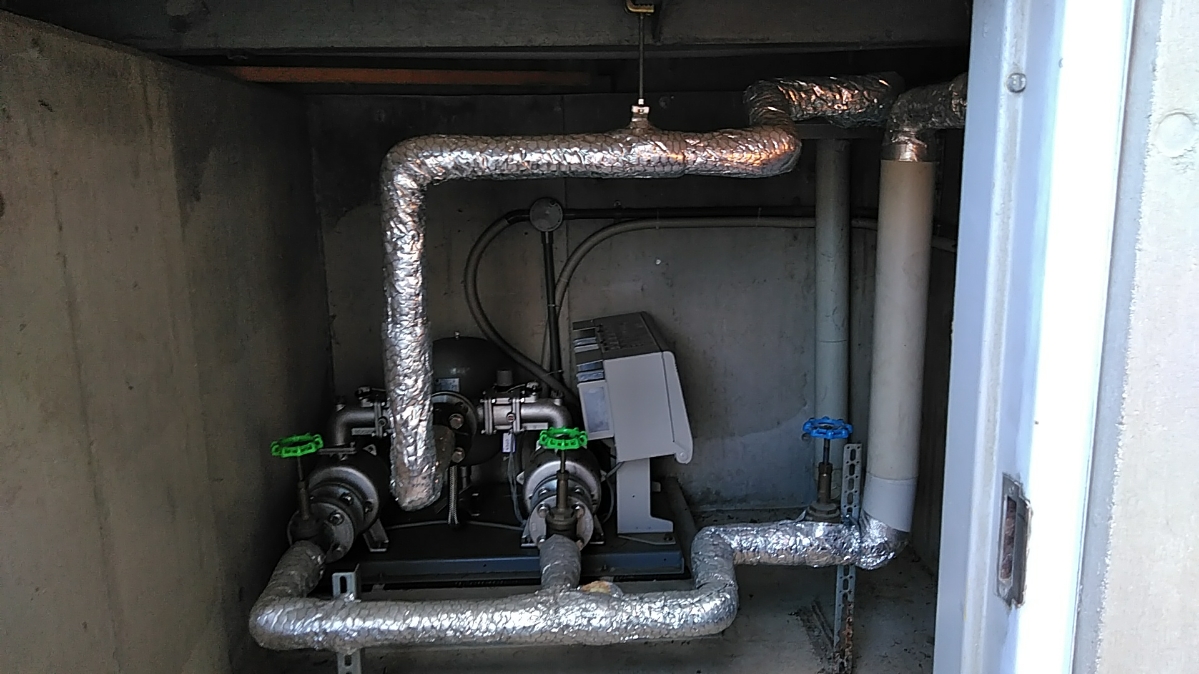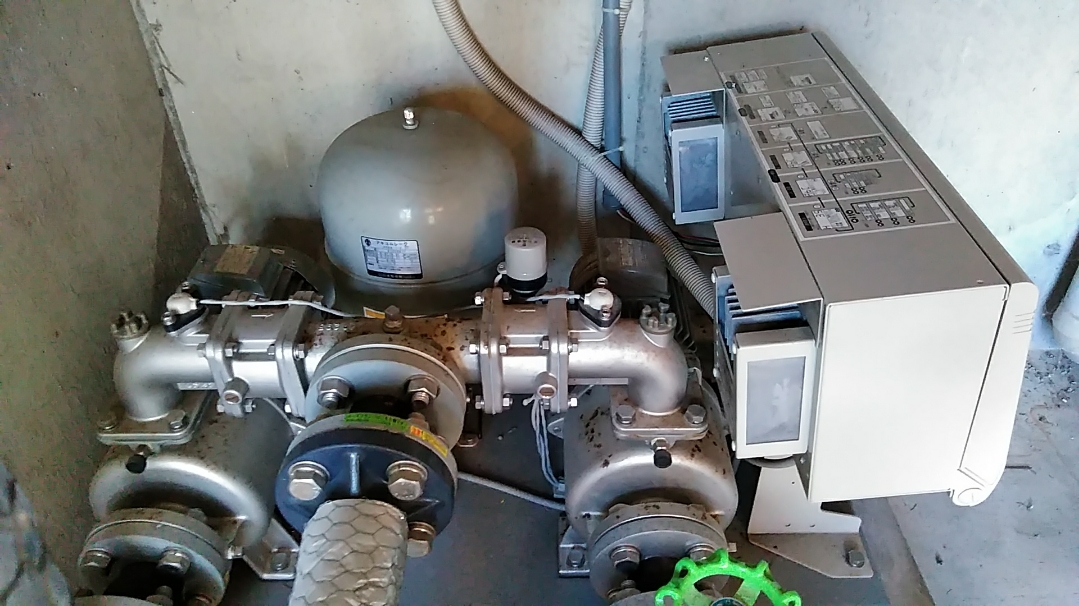 皆様のご自宅のお水を安全に届ける為に給水ポンプユニットも年1回の貯水槽清掃の際に合わせて点検します。ポンプ室内に人がいるのを見かけた場合は点検中の作業員だと思って下さい。