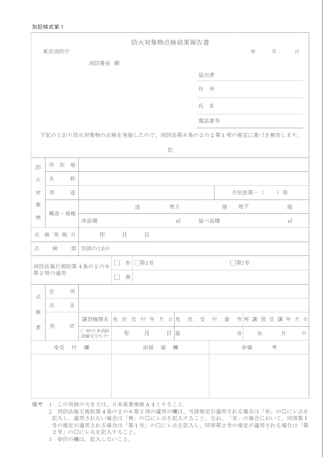 また、点検結果を「防火対象物点検結果報告書」にまとめ、管理権原者に提出します。消防署への報告(提出)は本来管理権原者等が実施しますが、管理会社や防災業者が代行する場合も多くあります。