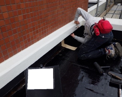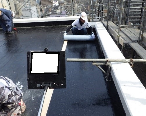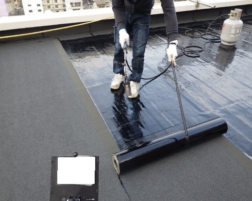 今回の工事では既存アスファルト防水の上に、もう一層アスファルト防水を貼り付ける