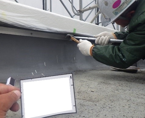 立上り部分は密着で新しいアスファルト防水を貼り付けるためです。撤去したコンクリート下地に付着している防水層残存物等のケレン及び清掃をします。