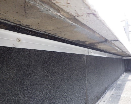屋上端部のパラペットあご下にある防水押え金物と立上り部の古いアスファルト防水層は撤去します。