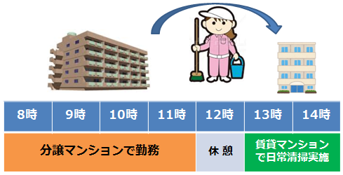 それでは日常清掃シェアリングの事例をご紹介します。 当社で採用・教育研修をした分譲マンション管理員が、自分の担当マンションでの勤務終了後、隣地の賃貸マンションで日常清掃を実施いたします。