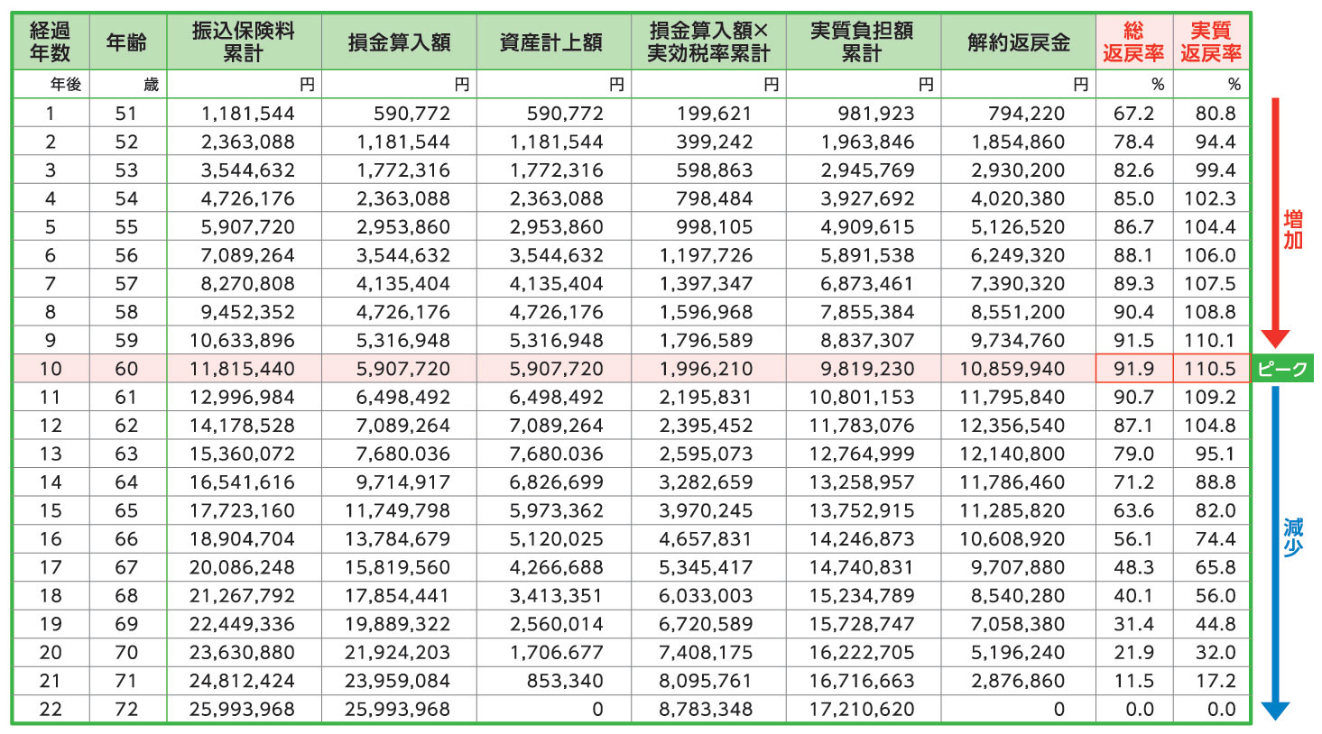 次に、解約返戻金と節税効果の推移を一覧にした表をご覧ください。ご注目頂きたいのは以下3点です。