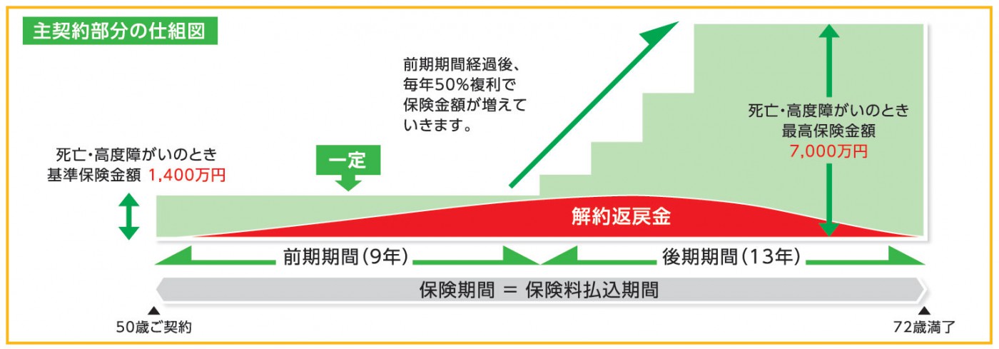死亡時の保険金が加入時から9年間は1,400万円と一定ですが、その後満期を迎えるまでの間、死亡時の保険金が徐々に増えていきます。