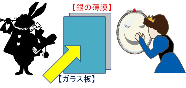 鏡は、「ガラス」の板と「銀」メッキしたうすい膜の二つからできています。