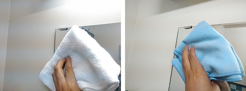 浴室を使用した後、鏡についた水分や汚れを「水拭き」「乾拭き」でしっかり取り除く