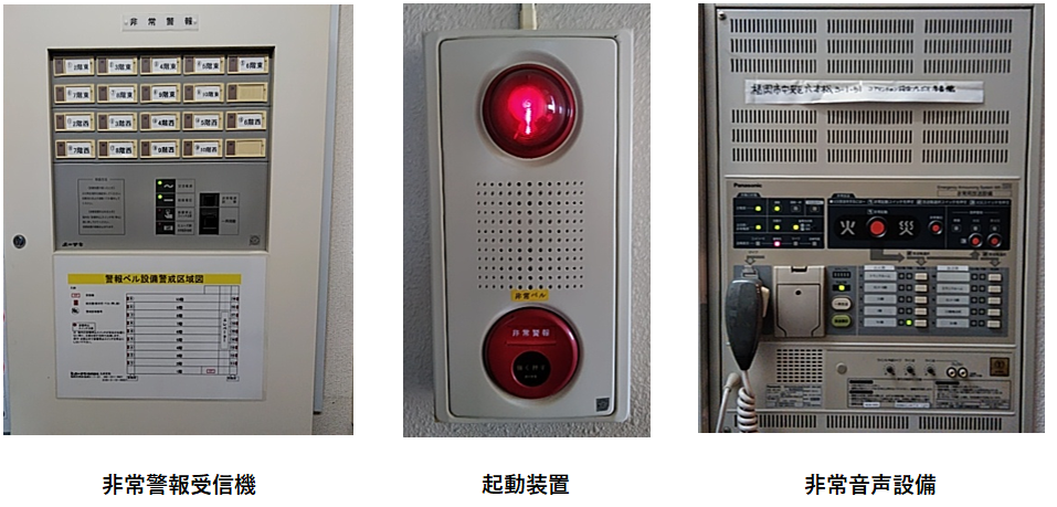 非常警報器具(非常ベル又はサイレン)と非常放送設備の2種類があります。