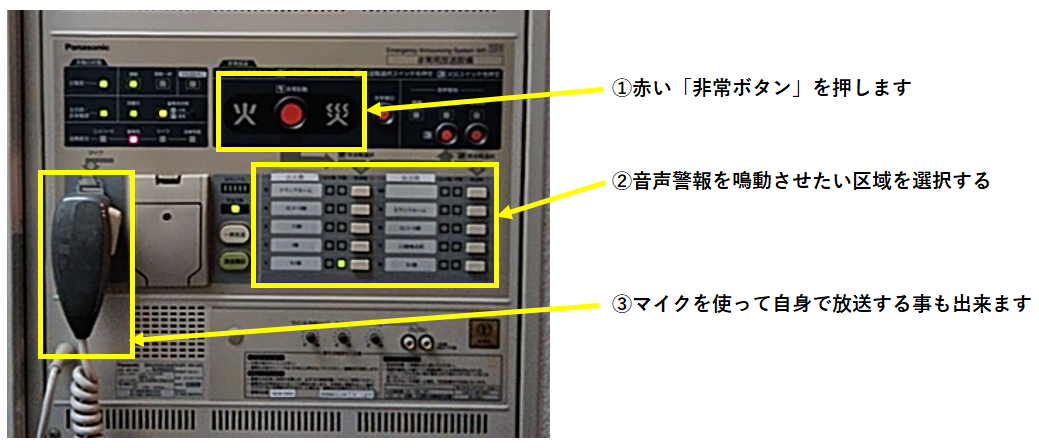 非常放送設備は基本的には自動火災報知設備と連動していますので火災の際は自動的に音声警報が鳴動します。手動で使用する場合は非常ボタンを押して放送区域を選択する事で音声警報が鳴動します。