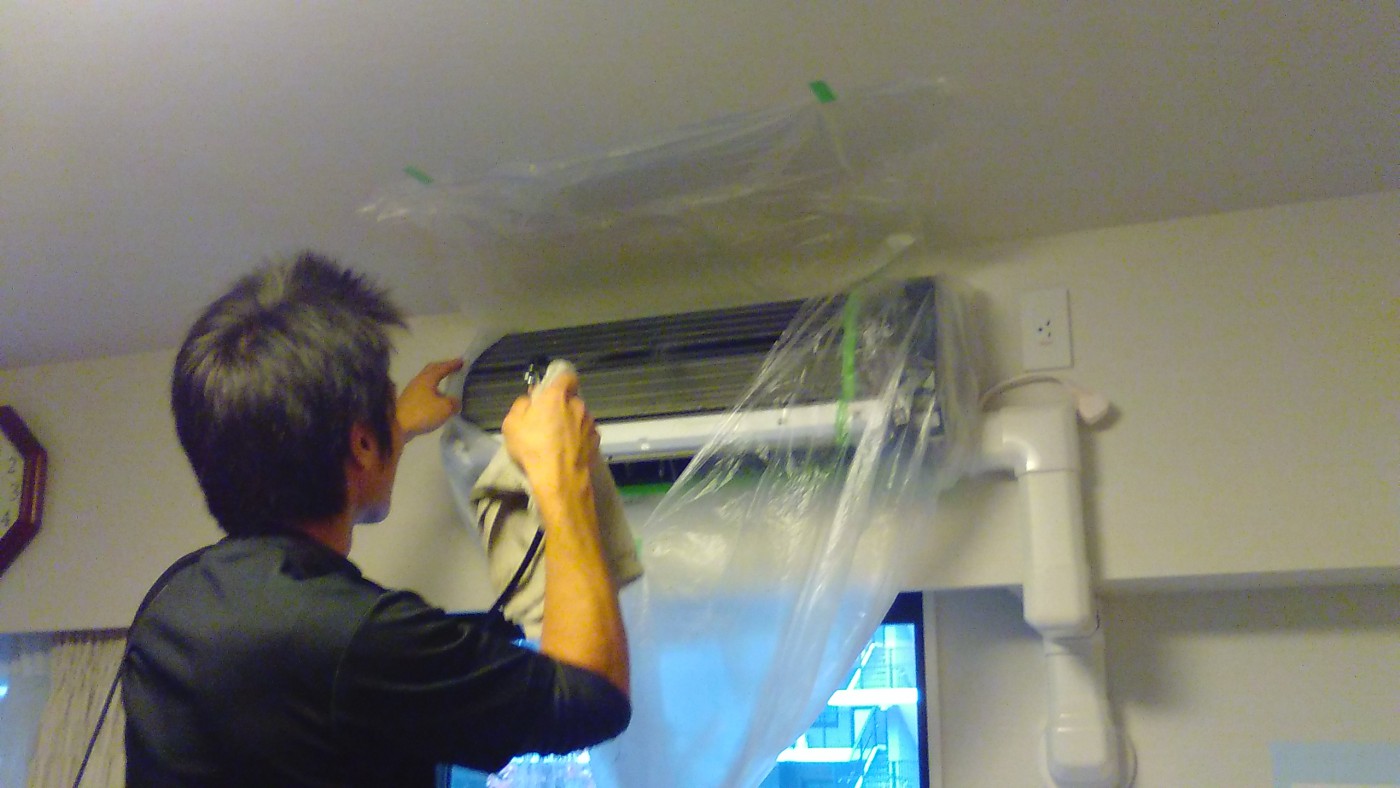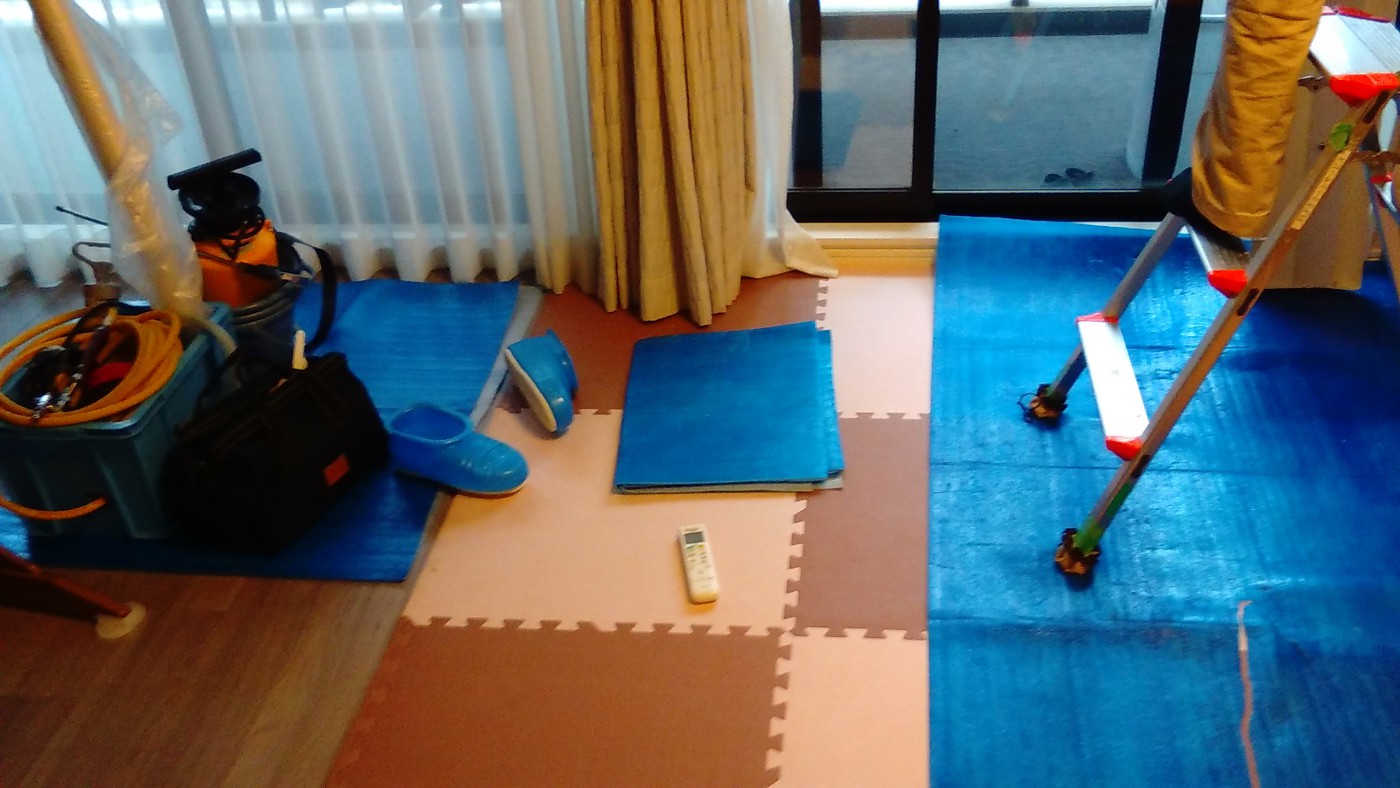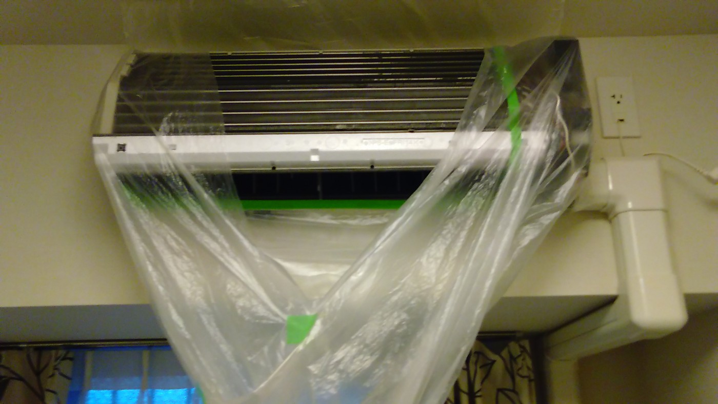 今回はリビングと寝室の2台をお願いしました。洗剤・水洗浄を行いますので他の箇所が汚れないようにしっかり養生していただきます。