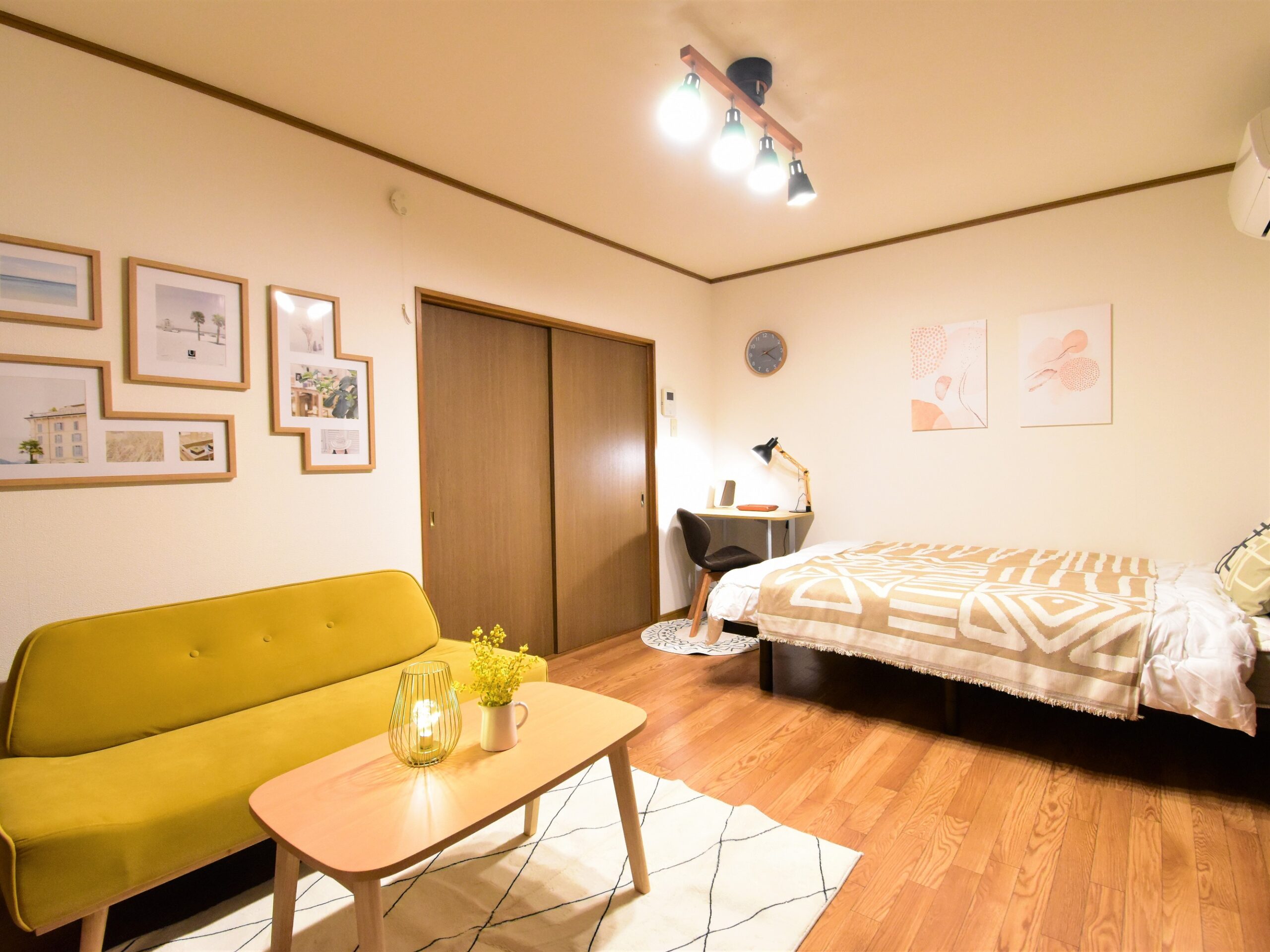 黄色のソファーと壁掛けインテリアが私のおすすめポイントとなります!