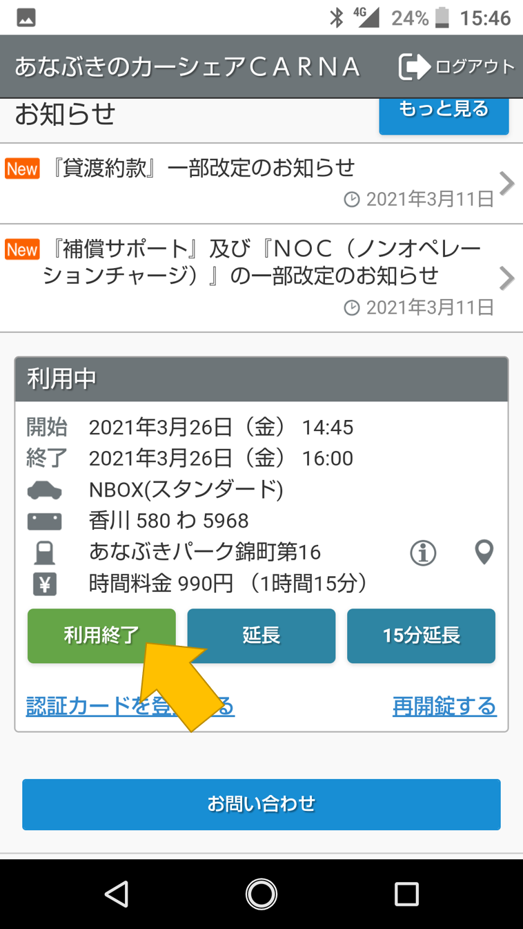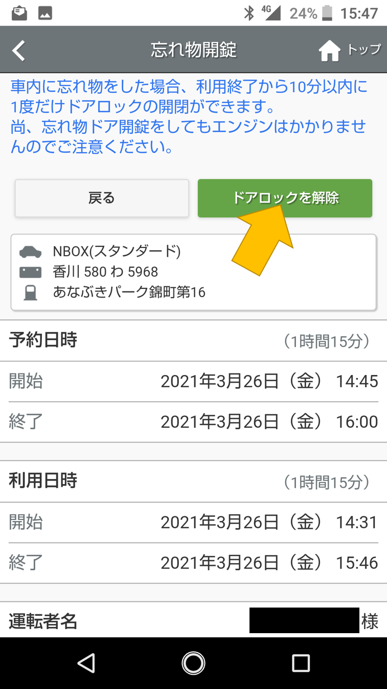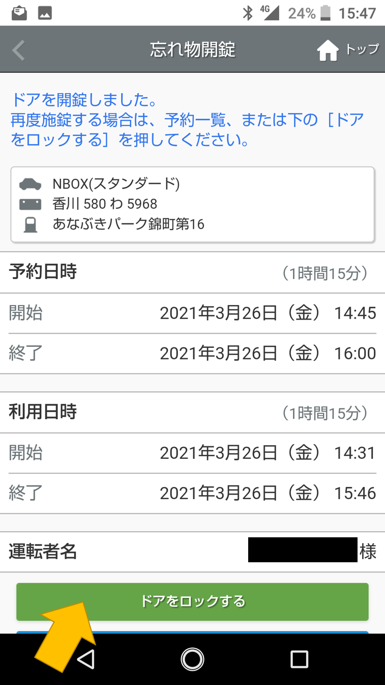 「利用を終了する」を押すと、ランプが点滅して車の鍵が閉まります!