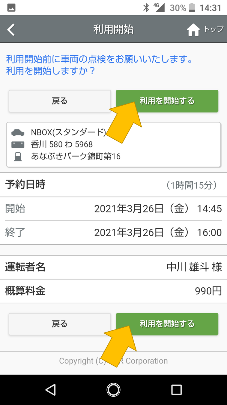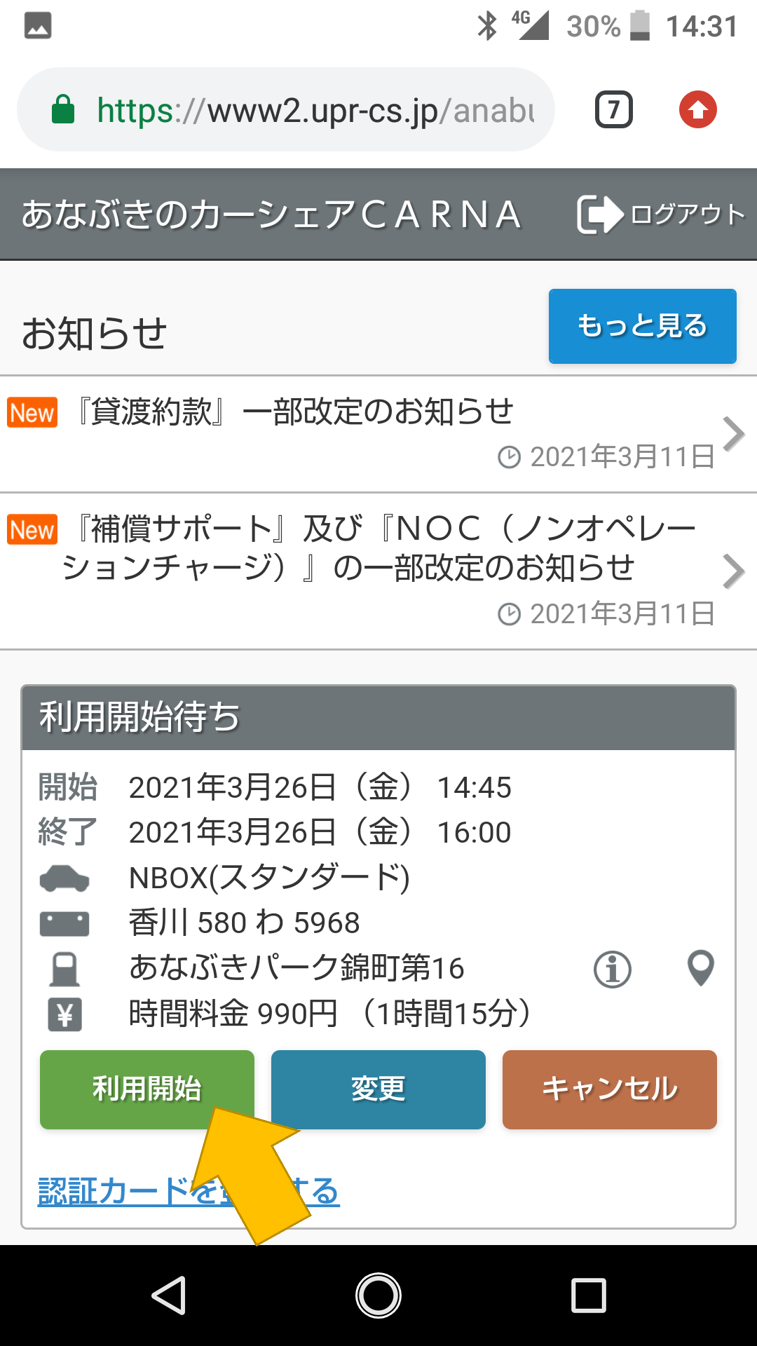 車の近くまで行き、「利用開始」のボタンを押します。