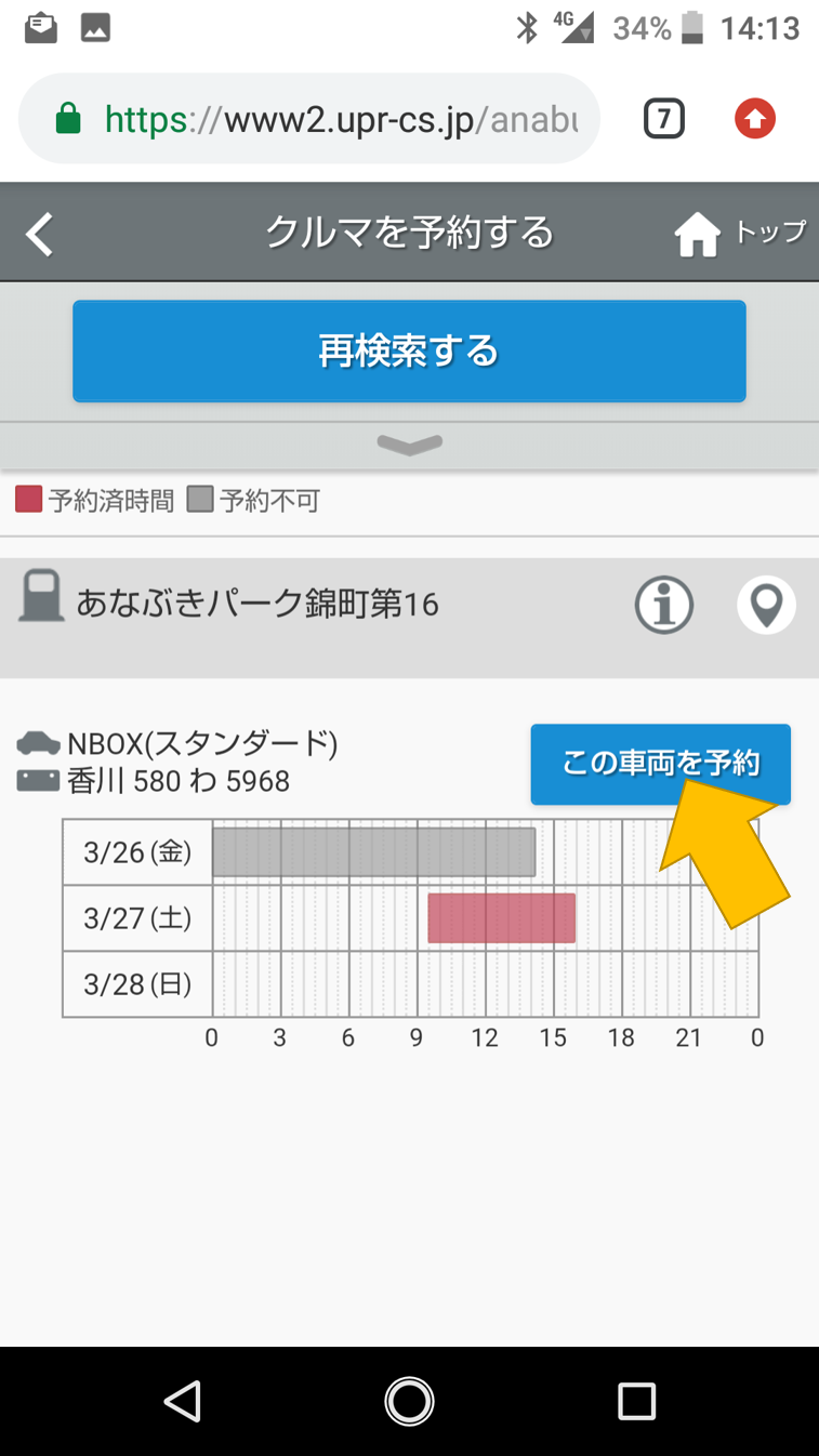 検索機能が出てきます。今回は「あなぶきパーク錦町第16」の「NBOX」を予約します。