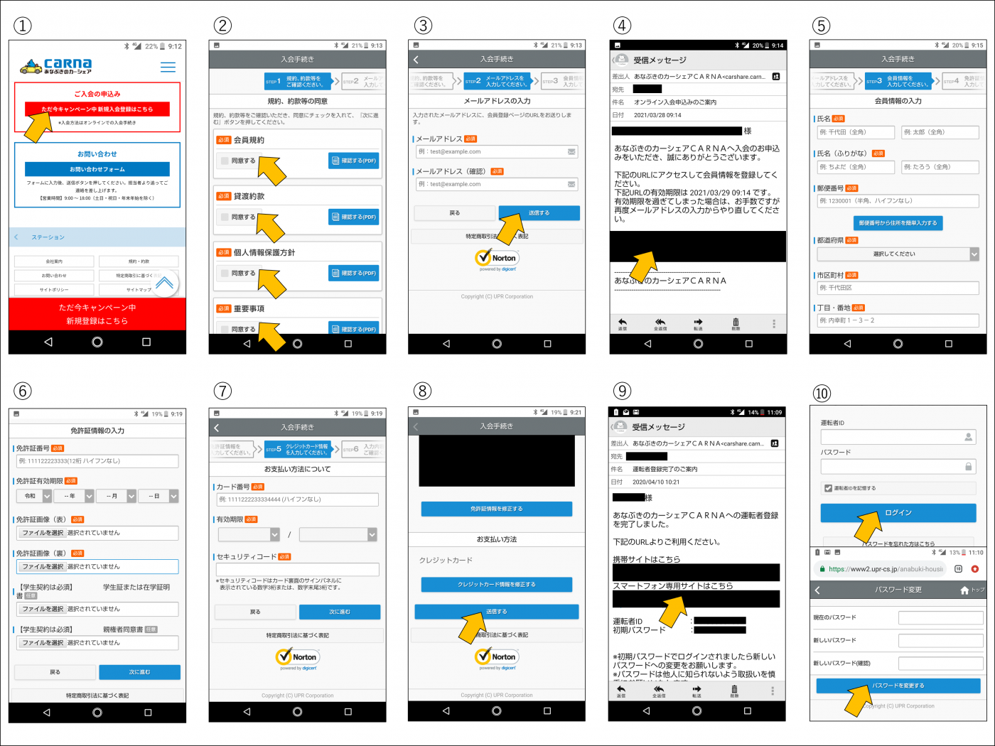 ⑩「スマートフォン専用サイトはこちら」から専用ログイン画面に入っていただき、運転者IDと仮パスワードでログインし、パスワードを好きな英数字で再設定したら、登録は完了です!