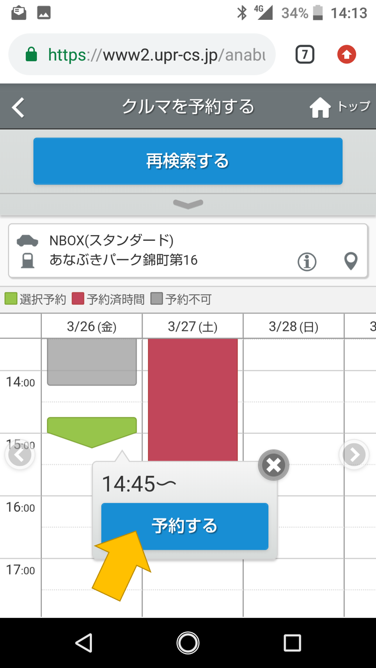 次の画面では、より詳細なタイムテーブルが表示されます。他の予約が入っていないことを確認して「予約する」を押してください。