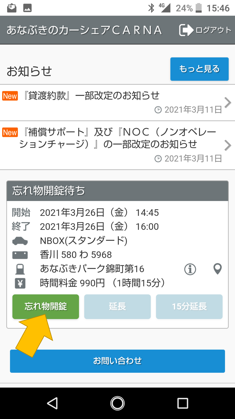 ログイン画面で「忘れ物開錠」→「ドアロックを解除」を押すと、車のドアが開きます!