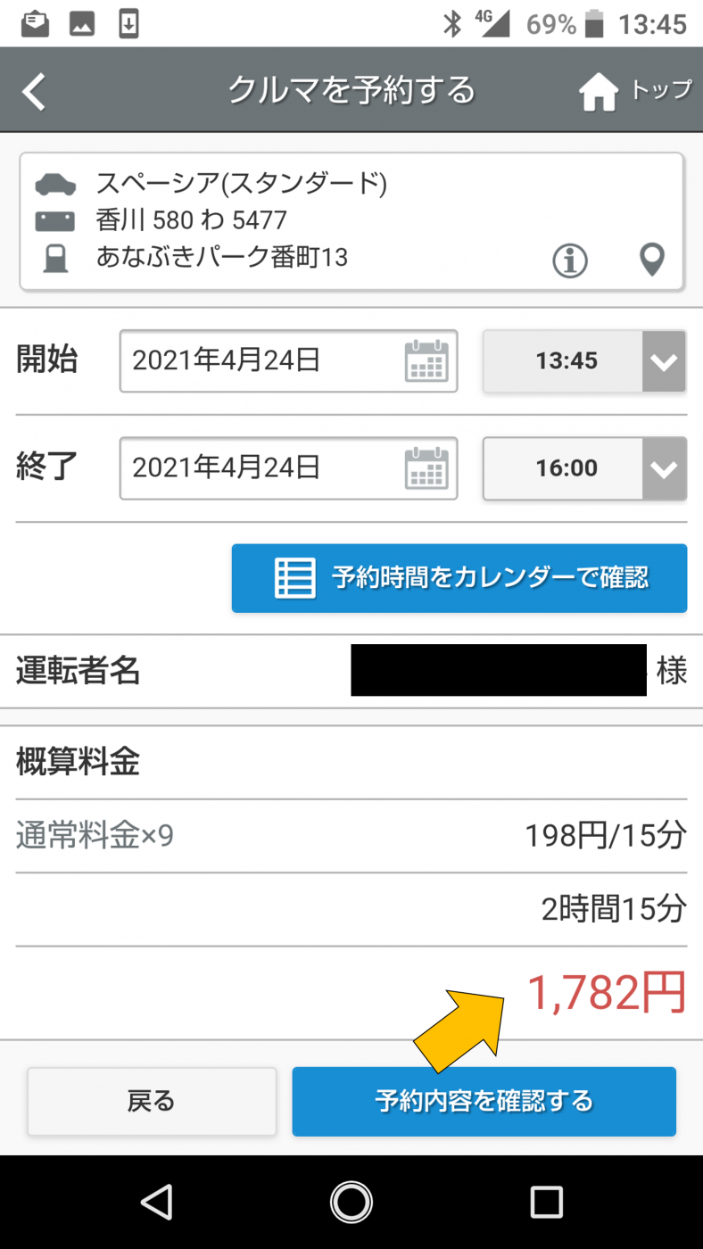 例えば、3時間予約して、2時間で返却した場合は、2時間分の料金「1,584円」が請求金額となります。