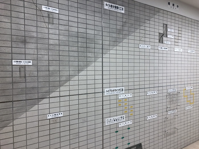「外壁タイルリフォームエリア」ではマンション外壁タイルの浮き・ひび割れ等の状況と、その修繕方法・手順を、実物のタイルで再現されています。