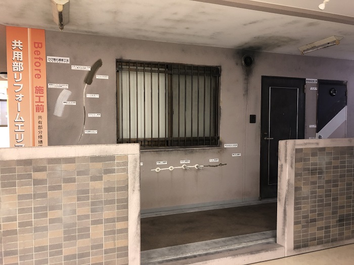 「共用部リフォームエリア」では共用廊下の壁のひび割れ、塗装部分や床の汚れ・キズを再現して、リフォームの方法や工法について紹介されています。