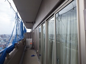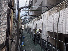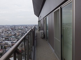 ・タワーマンションでの大規模修繕工事を数多く手がけてきた経験から、各住戸のバルコニーから隣のバルコニーへ移動する場合、隔て板を細工する事により効率的に作業できるようにしました。