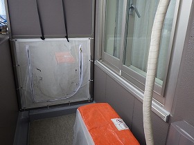 ●施工中のバルコニー内状況 ●隣戸隔て板ジッパーを開けて横移動します