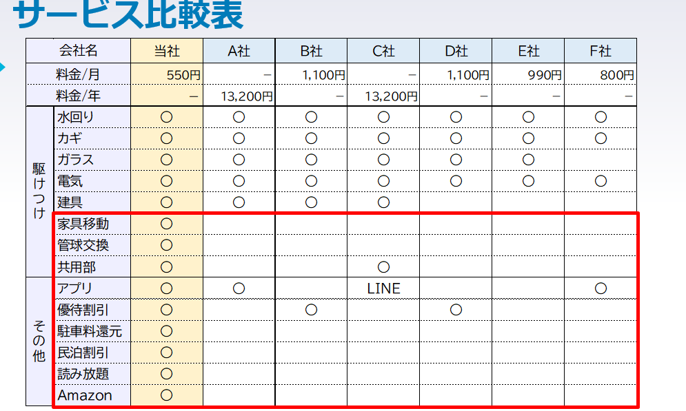 しかしながら、当社サービスは価格優位性もさることながら、駆けつけサービスのメニューが豊富なことに