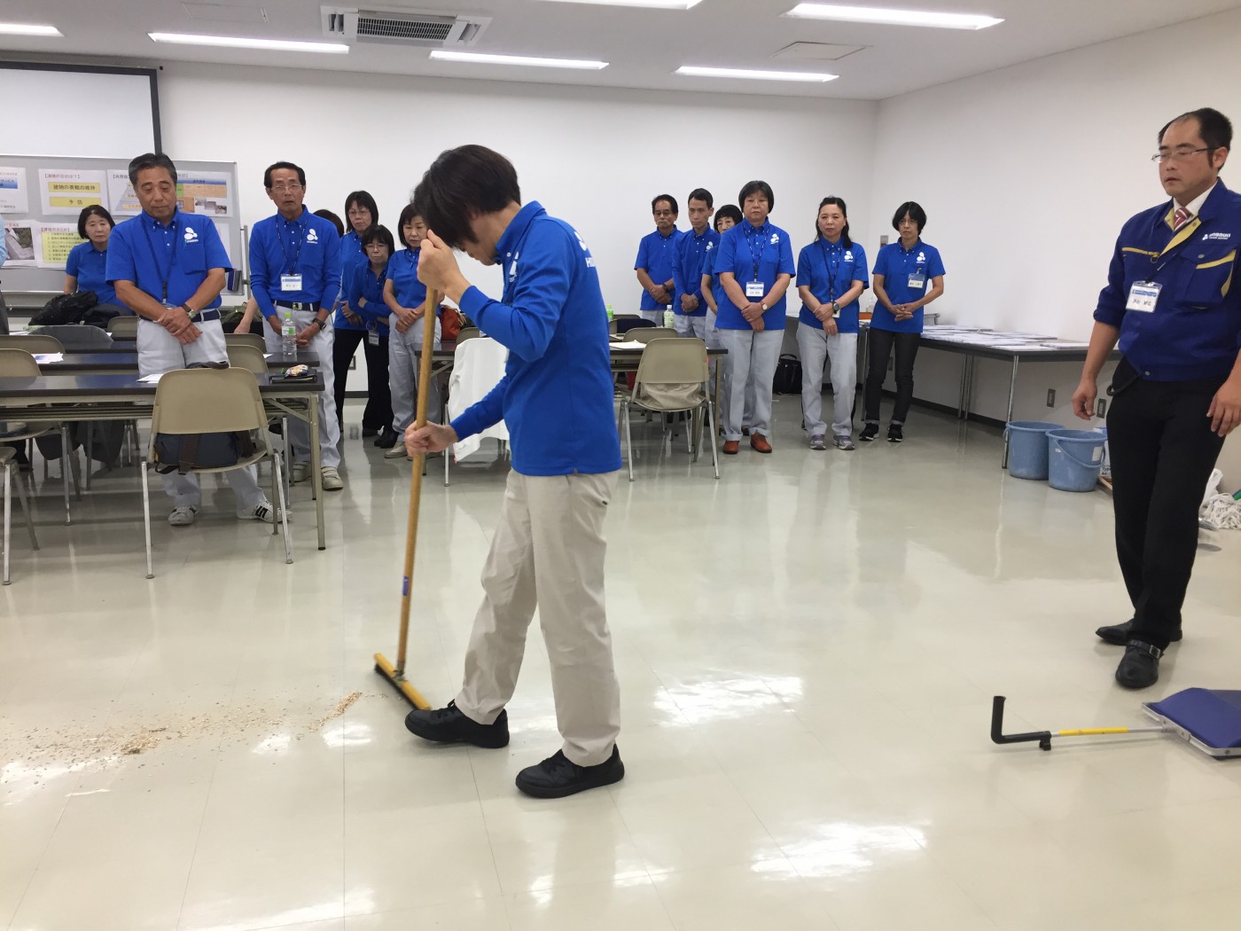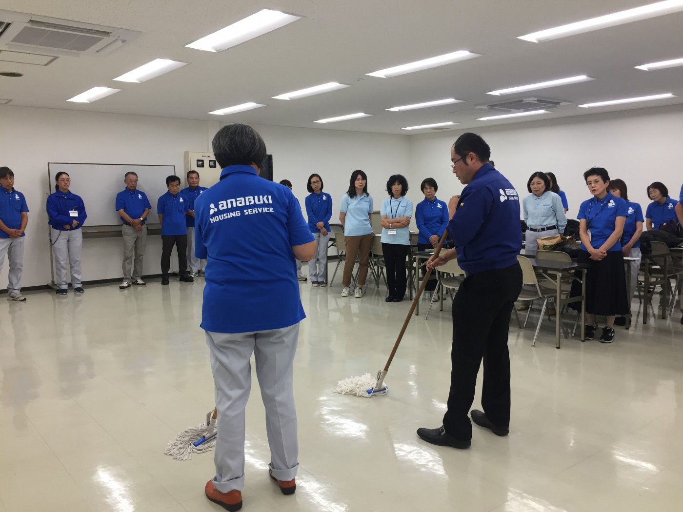 清掃の基本である掃き・拭きをあなぶきクリーンサービスの方に来て頂いて指導を受けました。清掃する場所によって、適したほうきの種類があることや、床や壁に付いた汚れを落とすために適した薬剤の紹介など、管理員さんにとって今後参考になることや、再度日頃の清掃について確認してもらう機会となりました。説明を受けたあとは、ほうきとモップを使って清掃を実践しました。