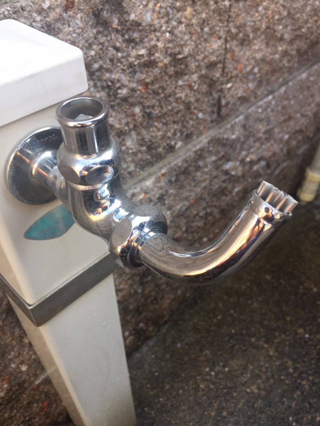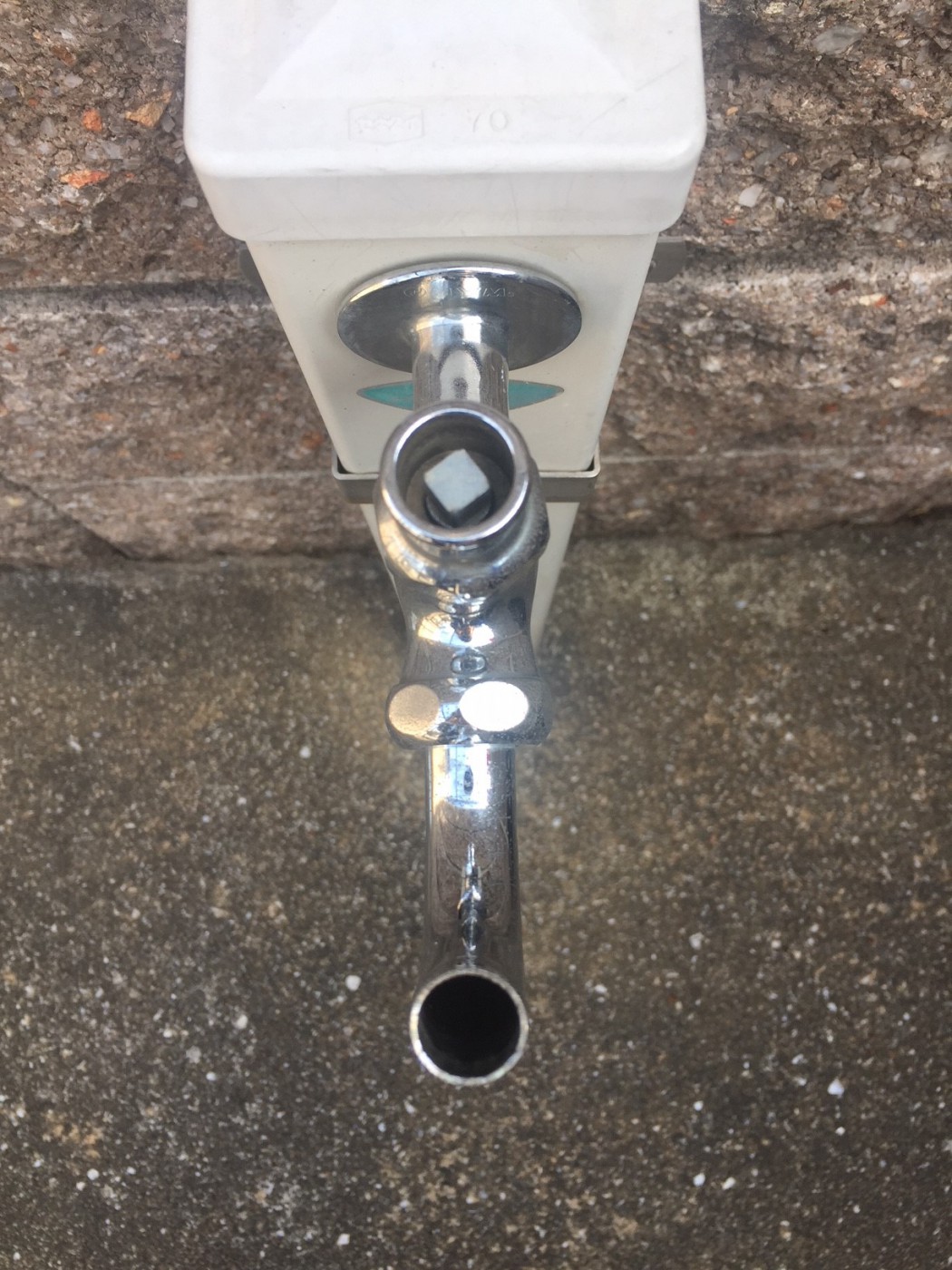 整流板がとれている状態の写真です。こう見るとなにか違和感を感じますね。またマンションの共用部にあたる水道は写真のようにハンドルを外している場合が多いです。共用部にあるものは居住者以外の人も触ることができるからです。専用の道具を使わないと水が出ないようになっています。