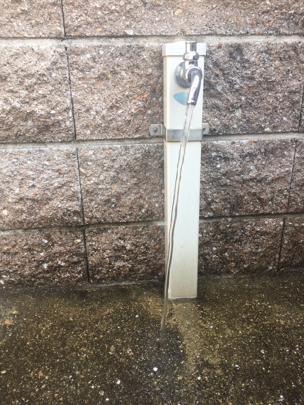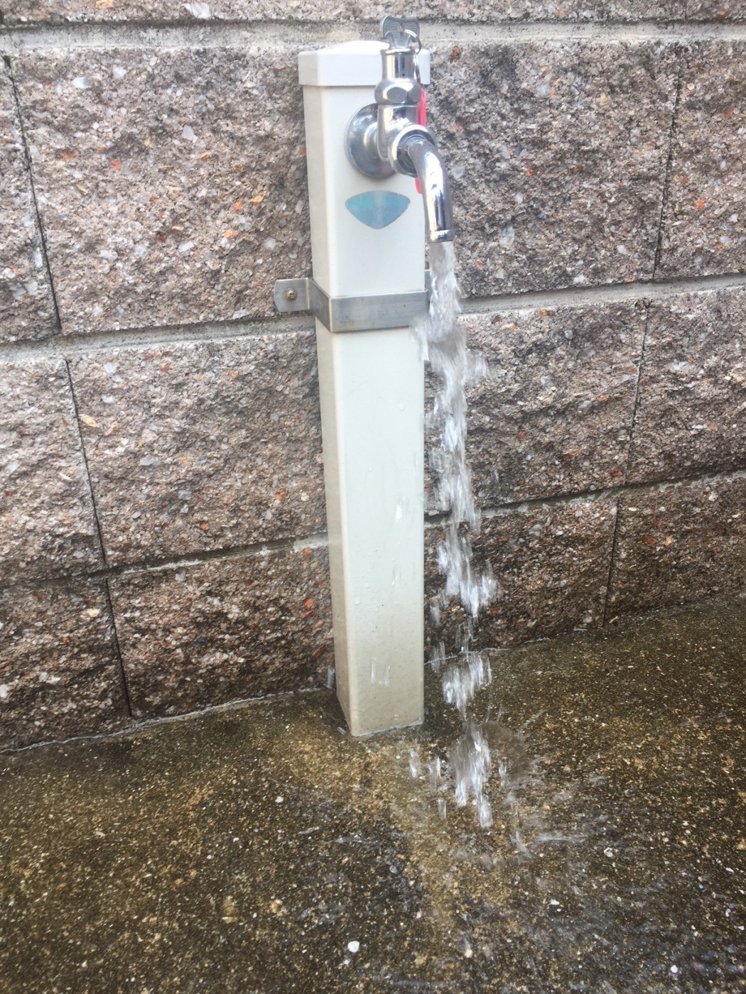 整流板が取れた状態で水を流したときの写真です。近くにいると服に水が飛び散り、あっという間に濡れてしまいます。また地面に着水する途中で周囲に水が飛び散ってしまい、着水したときの音もかなり大きいです。水に勢いがあるためホースをつけて水を流したり、手を洗うことは難しいです。