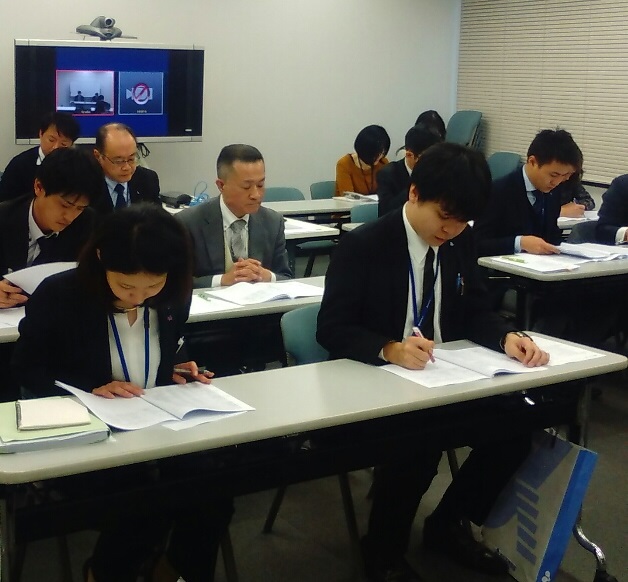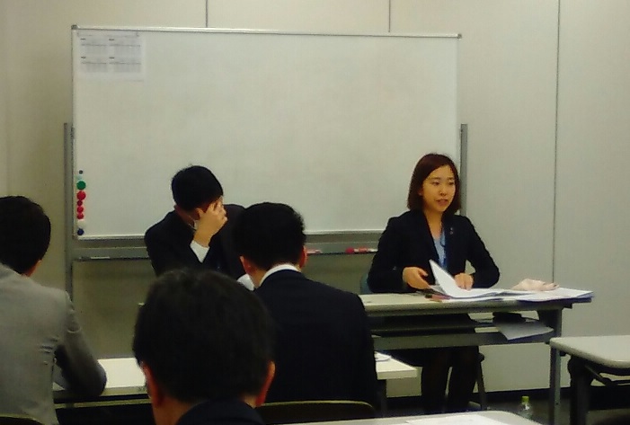 写真は模擬総会のときのものです。社員も組合員役となり議案を審議します。決算報告や重要事項説明等お題がだされます。発表者一人一人採点され発表後に総評されます。その場で答えることができなかった質問は終わってから復習です。