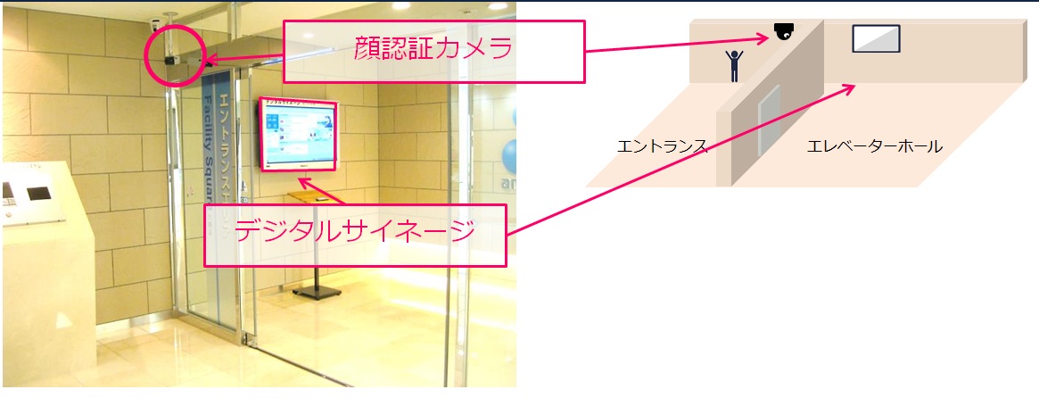 マンションのエントランスに顔認証カメラを設置、エレベーターホールにデジタルサイネージを設置します。
