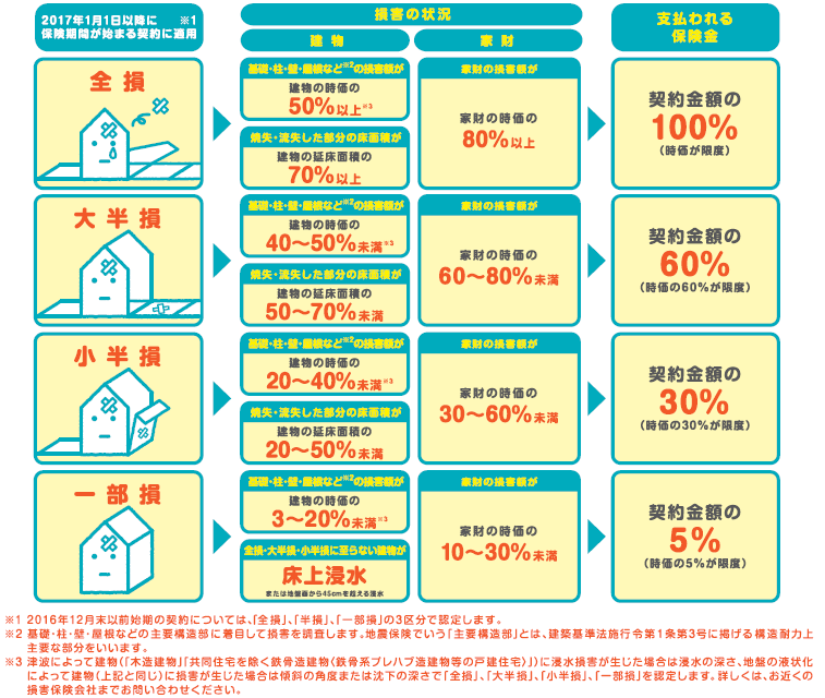 また、支払われる保険金は損害の程度によって「全損」「大半損」「小半損」「一部損」に区分され、それぞれの区分に応じた割合で保険金が支払われます。
