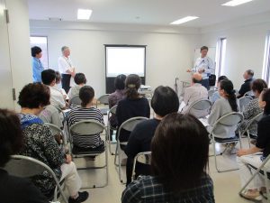 マンションの集会室や町の公民館などで、パワーポイントのスライドや印刷物を使用して「洗濯物情報」や「ベランダの片付け」、「網戸の取外し」、「車の移動」などをパワーポイントで説明します。