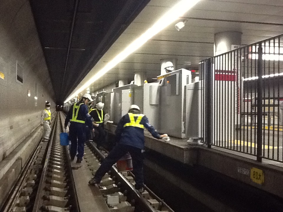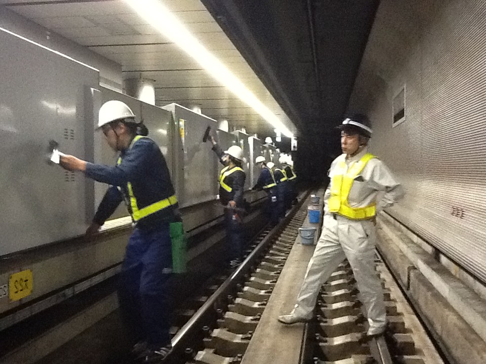 都営地下鉄大江戸線全駅のホームドア整備を行っています。写真は作業最終の清掃工事です。この工事は夜22時に駅へ集合、打ち合わせ後、終列車が出た後に乗客の有無、停電を確認してから始まり、始発が出る迄の間に完了させなければなりません。電車運行に支障が出ると大問題になります。当社の代理人、一作業員も短い時間で終了させなければならず、真剣そのものです。