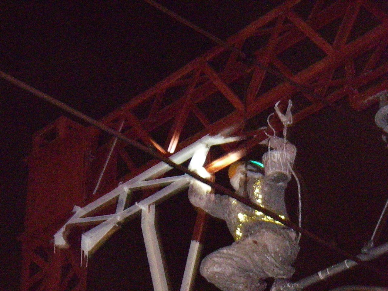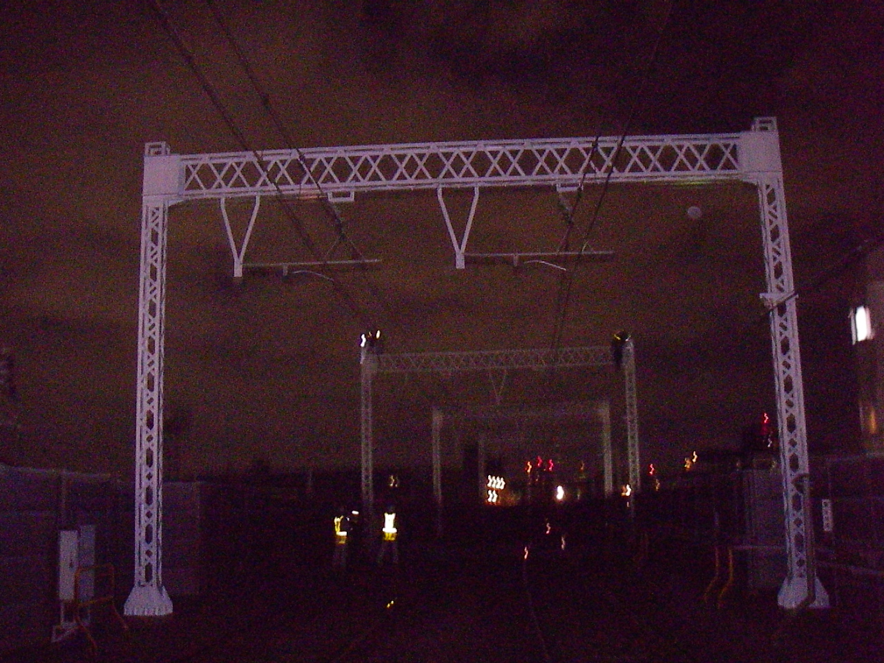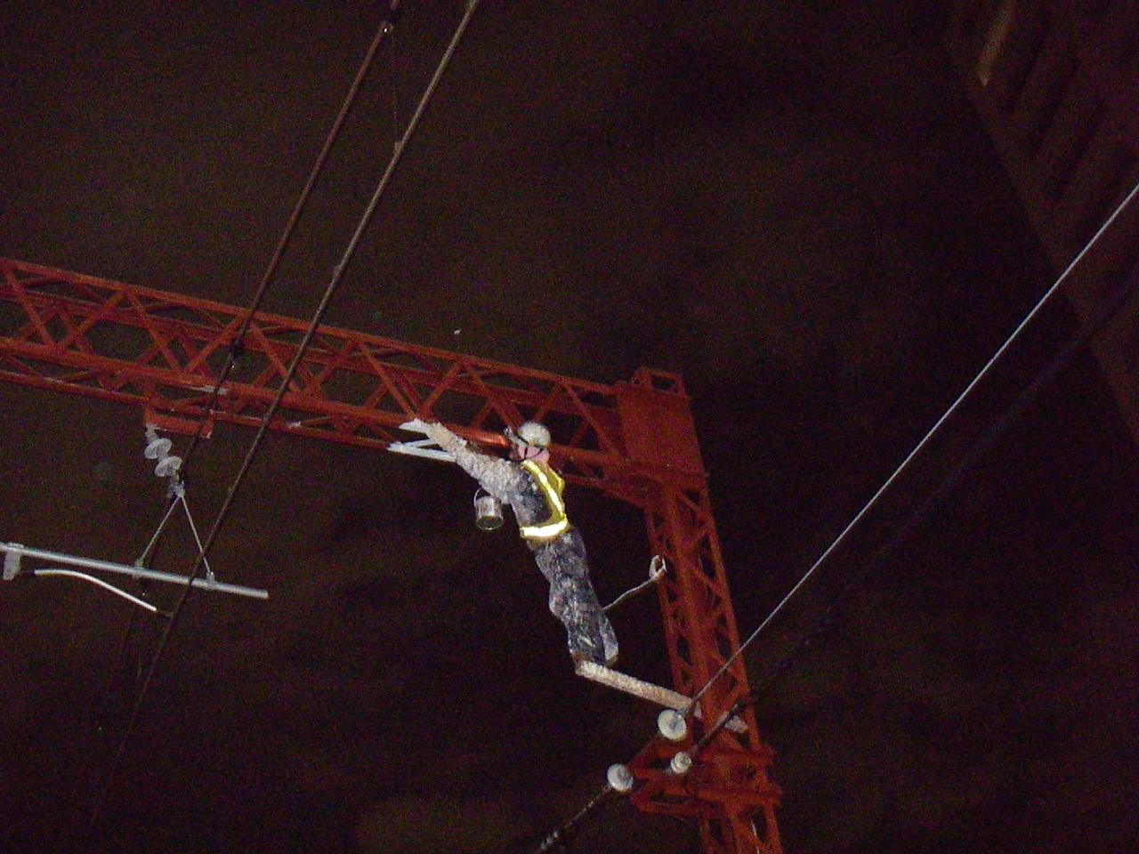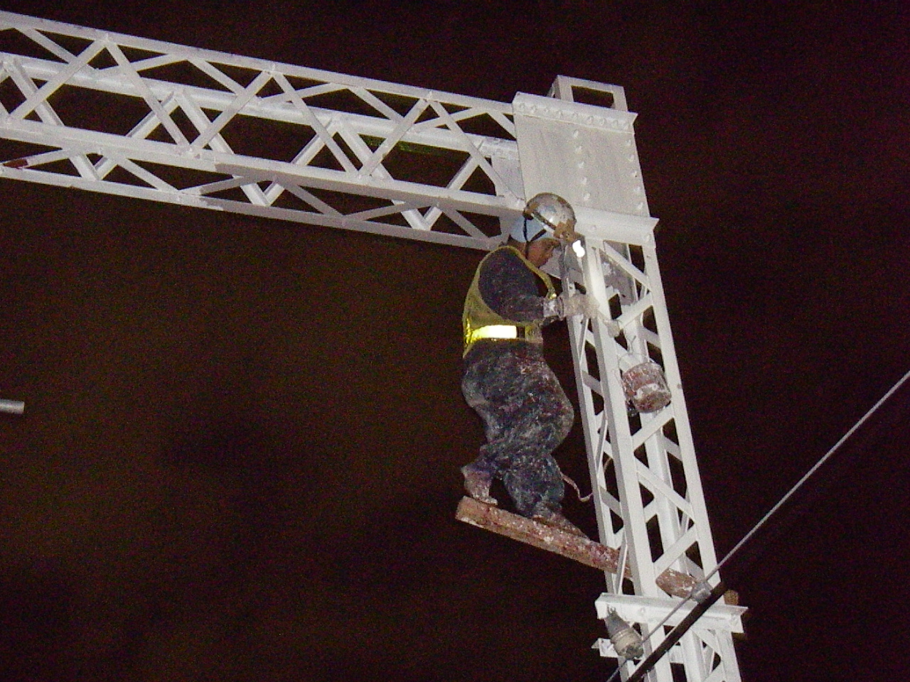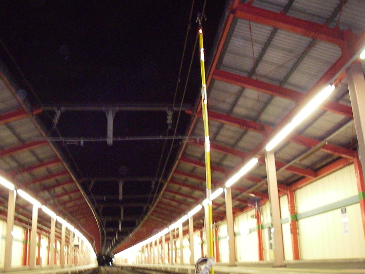 都営地下鉄新宿線トロリー線組立柱の塗装工事の写真です。この塗装工事も終電後、始発迄の短時間で作業を終了させなければならないので、足場を組み立てることもできず、まるで曲芸まがいの作業状態となり、ひと時も気を抜くことができません。