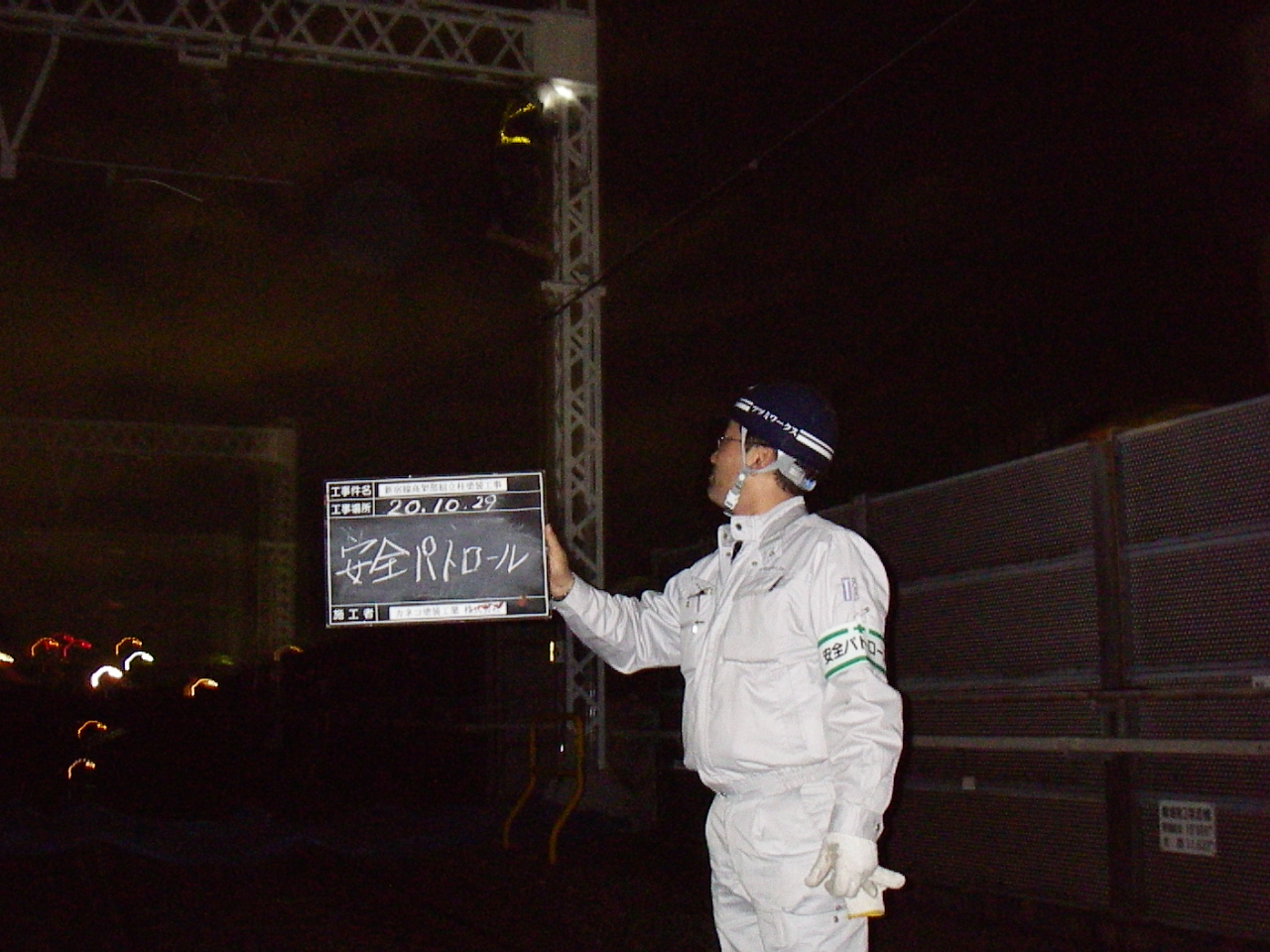 夜間、交通量が減ってから作業を行います。歩行者、通過車両に対して接触等の事故が起きないよう細心の注意を払います。