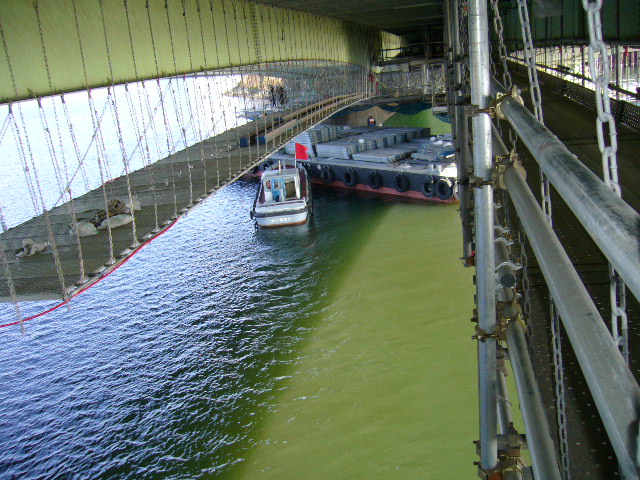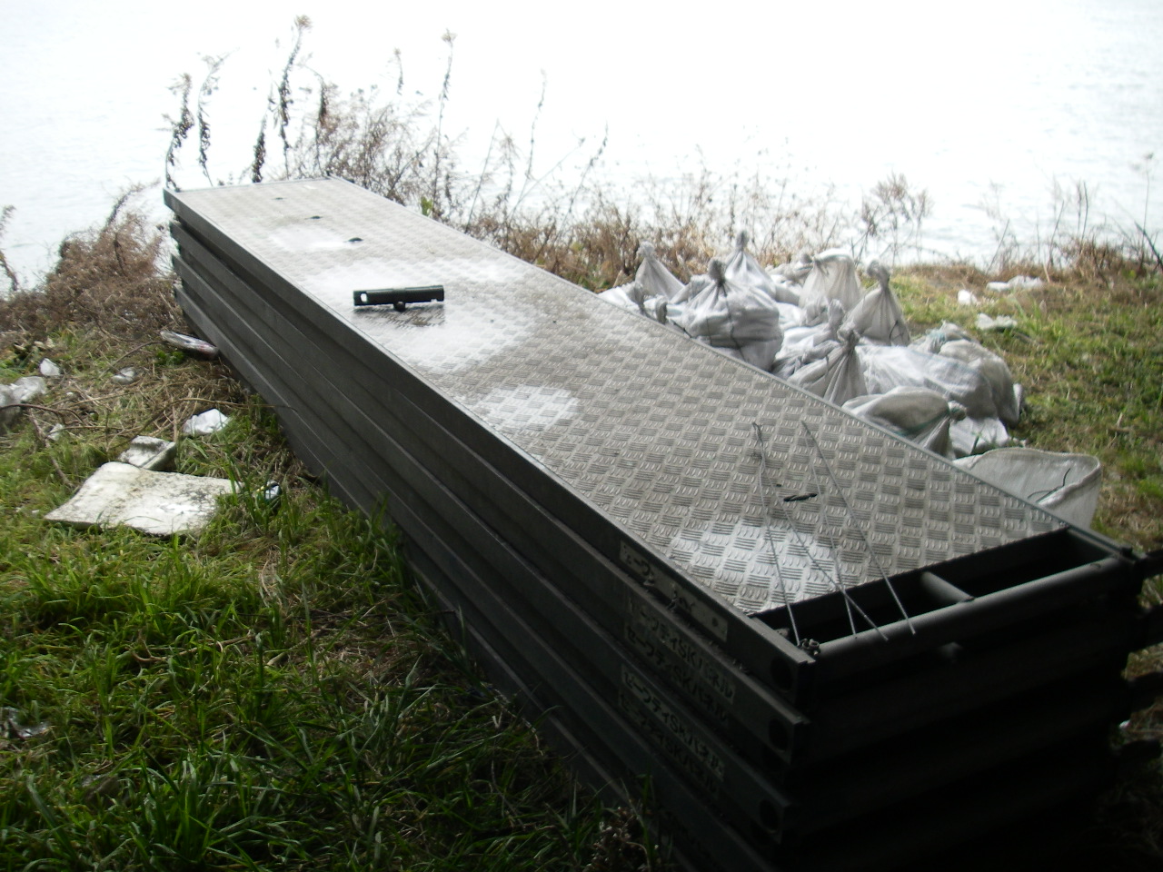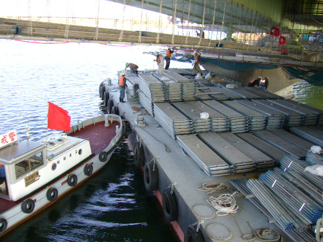 マンション大規模修繕工事同様、足場架設から直接工事が始まり、台船を使用し足場材を搬入、吊足場(橋から吊り下げている足場)を設置します。