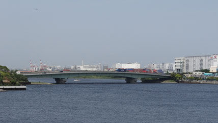 この橋は東京港野鳥公園、中央卸売市場のある東海3丁目から対岸の城南島を結ぶ東京港臨海道路に架かる橋で、なかなか景色の良いところです。