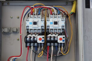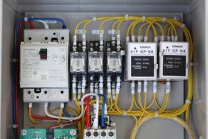制御盤の中に小さな四角い箱のようなものが並んでいる部分をフロートレスユニットと呼びます。これは、貯水タンクの中の水位を検知するための電気信号回路です。