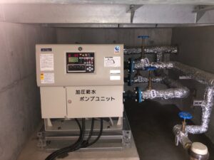 マンション敷地内にある受水槽(貯水タンク)に一度水を貯めて、その水を各お部屋に送るために必要なポンプです。