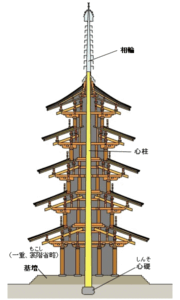 五重の塔の真ん中に心柱という柱を地面から上部まで設置し、地震の際、左右に揺れがあっても塔そのものが振り子の様に揺れ各階に損傷を与えない様な特殊な構造になっております。