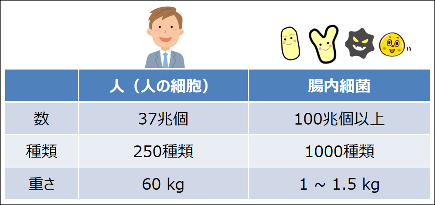 私たちの体には100兆個を超える数の微生物が存在するといわれており、これに対して人体を構成する細胞の数が約37兆個となることから、細胞以上に多くの微生物と生活していることになります。