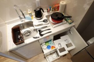 全室ミニキッチン付きで、基本的な調理器具・調味料は一通り揃っております。