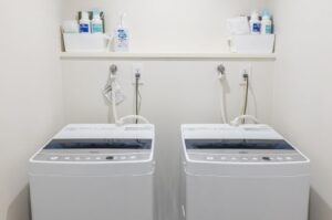 1階にランドリールームがあり、そこに2台の洗濯機と洗剤、柔軟剤、洗濯用ネットを準備しております。