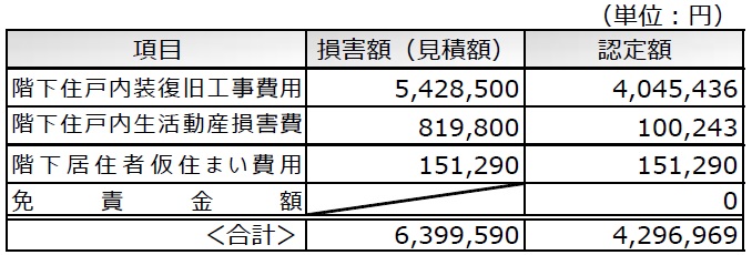 階下の住戸では被害がほぼ全ての居室で発生していたため、内装復旧工事完了までの約1ヵ月間は近くのマンスリーマンションへの仮住まいについて認定されました。