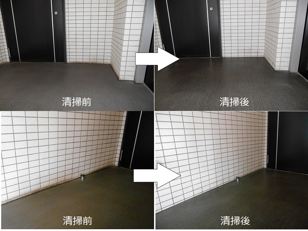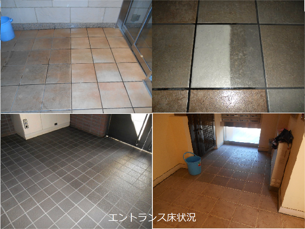 エントランス床では全体的に少しずつ汚れて行きますのであまり気付く居住者様はいませんが、意外と汚れているのが現実です。