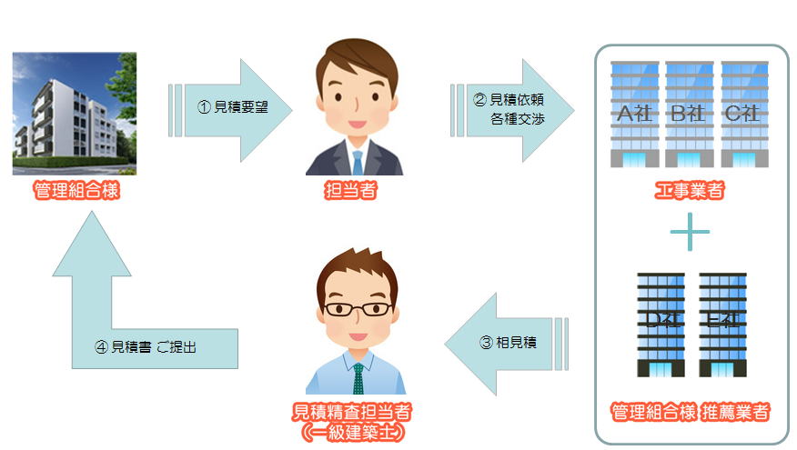 また、修繕の工事見積を取得する時も下図のようにマンションの担当者と見積精査担当者(一級建築士等)が工事金額だけではなく妥当性も二重でチェックします。