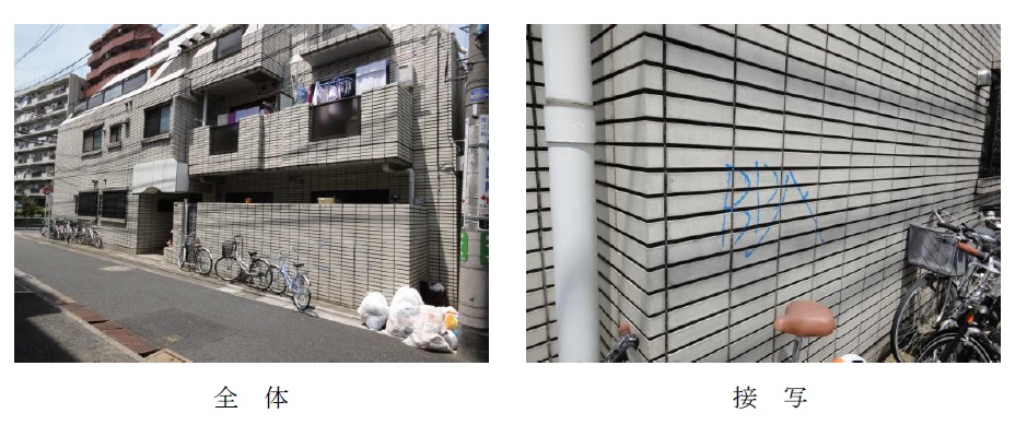 ごみ置き場が2箇所あり、可燃ごみや不燃ごみを入れるごみ置き場と粗大ごみを入れるゴミ置き場に分かれている。可燃ごみと不燃ごみのごみ置き場の扉にはいずれも鍵がかかるが、粗大ごみ置き場の方は鍵がかからない扉となっており、粗大ごみ置き場内部の壁面に大きくいたずらと思われる落書きがされているのが発見された。