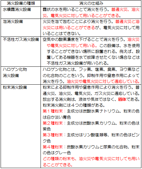 油火災の場合、水を使うと火が大きくなり、電気火災は、水を使うと感電の危険性が生じます。この場合は、特殊な消火設備を用います。